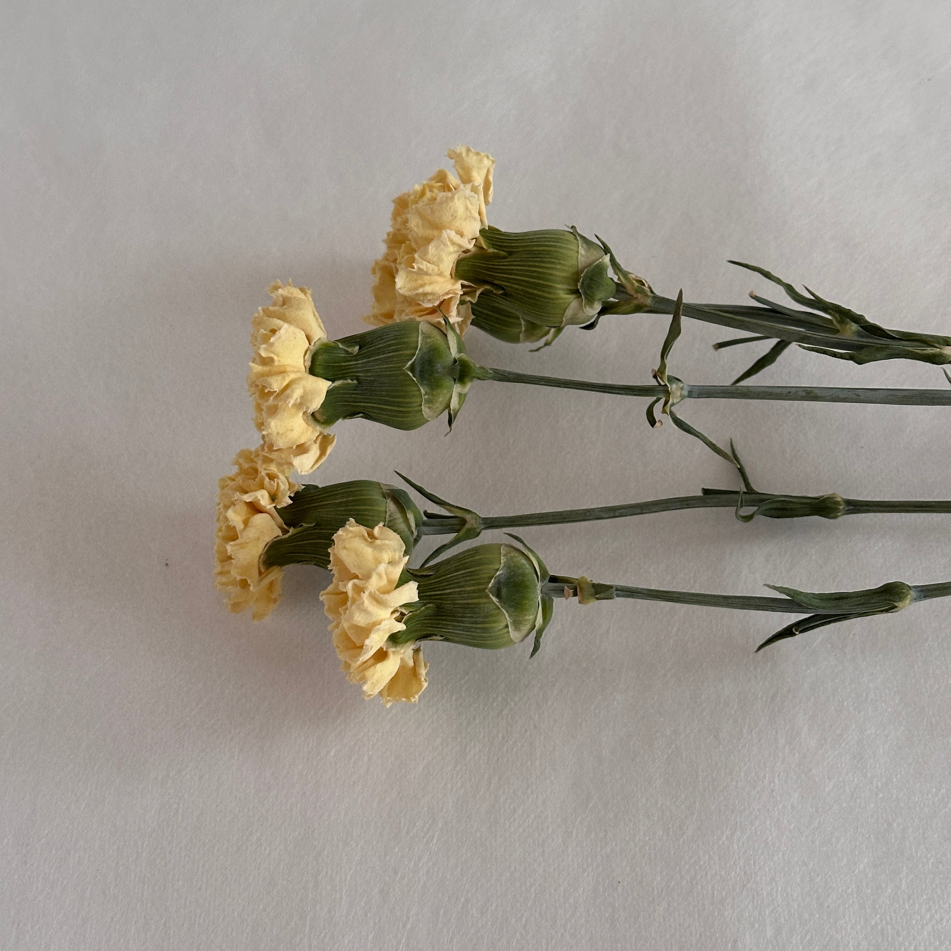 カーネーションは全体的に水分を多く含んでいるため、ドライアップには根気強く、とても長い時間を要します。じっくりと水分を抜いていく過程で、あんなに大きく開いていた花びらはぎゅっと凝縮され、驚くほど小ぶりで愛らしい姿へと移ろいました。